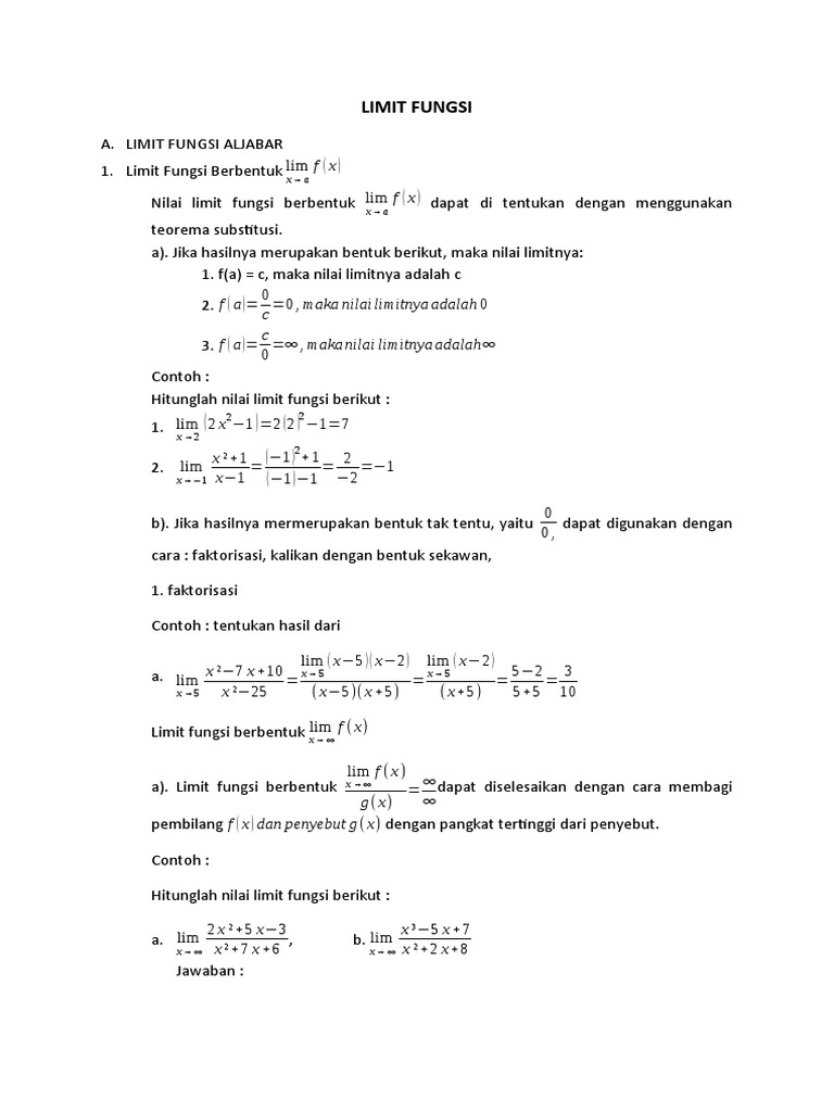 Contoh Soal Limit Fungsi Halaman All Kompas Com from asset.kompas.com Find a smooth curve that connects the points (x, y) given by y = (x − 1)! Berikut ini merupakan contoh soal dalam menyelesaikan permasalahan pada konsep limit. X = ax + b , dengan a dan b konstanta dan x variabel maka rumus fungsinya adalah f(x) = ax + b. Strategi substitusi langsung, strategi membagi dengan pangkat tertinggi, strategi mengalikan dengan bentuk sekawan, dan strategi faktorisasi. Sep 02, 2019 · ada beberapa cara untuk menentukan jawaban dari limit fungsi aljabar di mana nilai x tak berhingga yaitu: Jadi, bisa dibilang limit adalah nilai yang didekati fungsi saat suatu titik mendekati nilai tertentu. Perpindahan kalor secara radiasi (pancaran) perpindahan kalor secara konveksi paksa maret (17) februari (6) januari (8) 2015 (44) desember (6) november (6) oktober (1) Apr 20, 2021 · pengertian limit fungsi.